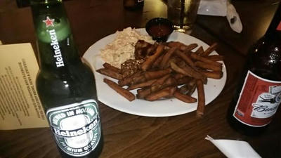 ブタ肉とフライドポテト(サツマイモで作ってる?)。